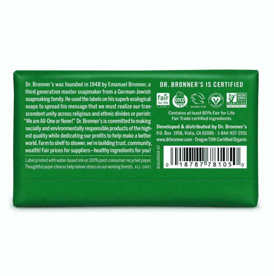 Dr. Bronner's Pure-Castile Bar Soaps are gentle and versatile, good for washing the body, face or hair.