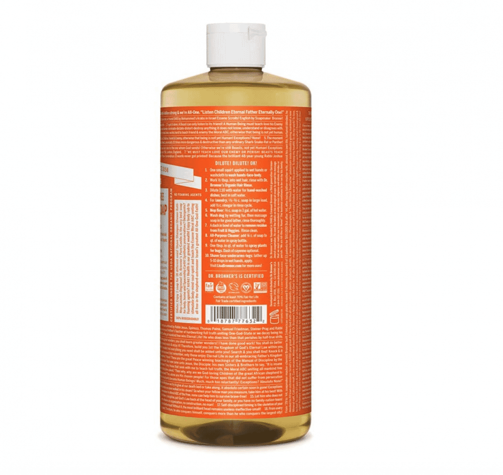 Dr. Bronner’s Pure-Castile Soaps are good for just about any cleaning task. Face, body, hair and food, dishes, laundry, mopping, pets and cleaning your house with no synthetic preservatives, detergents or foaming agents.