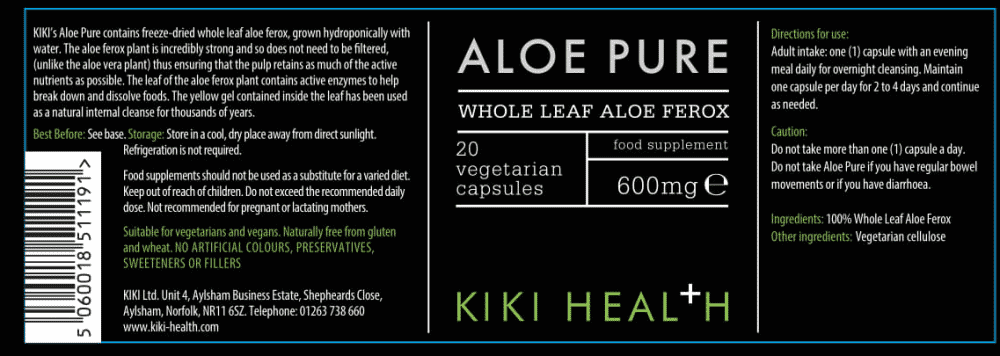 Aloe Pure contains freeze-dried whole leaf aloe ferox, grown hydroponically with water.