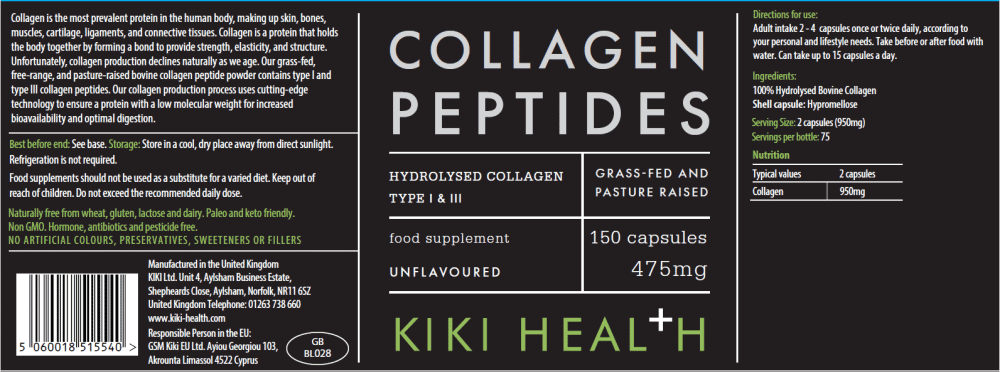 Kiki Health's bovine collagen peptide powder is derived from grass-fed, free-range, and pasteurised cattle. The collagen production method combines cutting-edge technology to ensure bioavailability and optimal digestion. Type I & III collagen, helps to increase collagen production. Fully digestible.