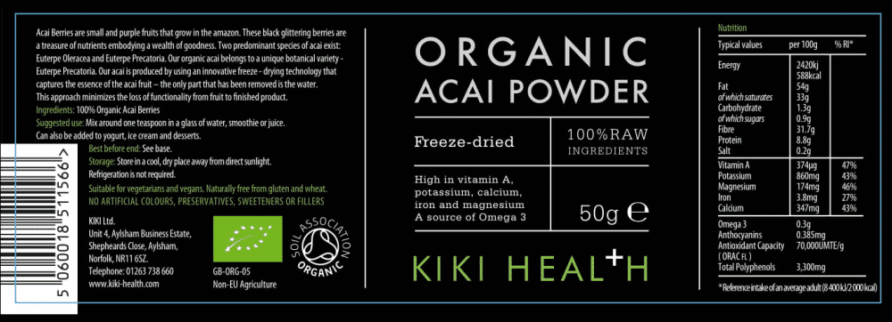Kiki Health's Acai Powder is made from pure organic, raw acai berries from the Amazon rainforest which have been freeze-dried to retain the vital nutrients and ­flavour of the fresh fruit. These power packed little fruits are high in vitamin A, potassium, magnesium, calcium and iron.
