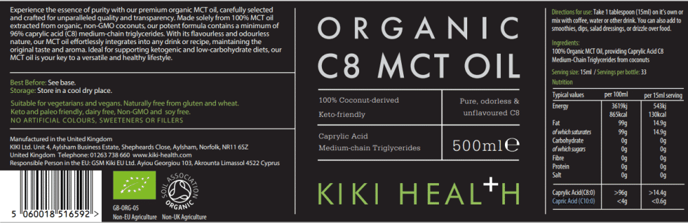Experience purity with Kiki Health's premium organic MCT oil, made from 100% non-GMO coconuts and containing at least 96% caprylic acid (C8) MCTs. Flavourless and odourless, it blends seamlessly into any drink or recipe. Perfect for ketogenic and low-carb diets.