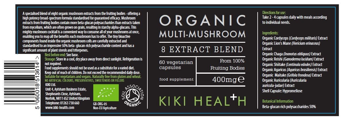 From 100% fruiting bodies - dual extract, beta-glucan rich polysaccharides 50%. Organic Multi-Mushroom Extract capsules are a specialized blend of eight organic mushroom extracts - providing a high-power broad-spectrum recipe standardized for assured effectiveness.