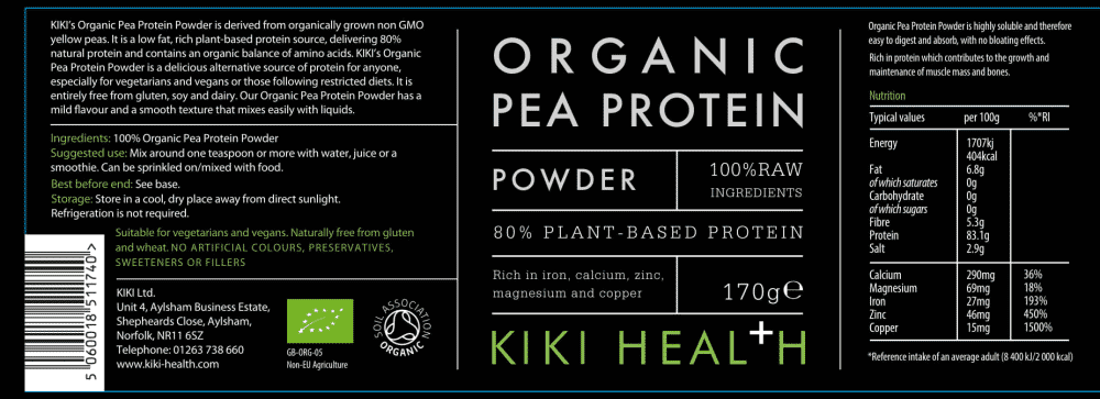 KIKI’s Organic Pea Protein Powder contains over 82% natural plant based protein, which is essential for anyone wishing to maintain or build muscle. Pea protein powder is a versatile ingredient and blends well into a smoothie or juice.