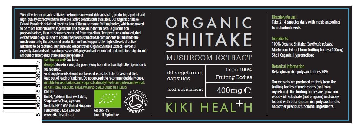 From 100% fruiting bodies - dual extract Beta-Glucan rich polysaccharides. Shiitake mushrooms are one of the most popular mushrooms worldwide. They are appreciated for their rich, savoury flavour and varied health benefits. Kiki cultivate their organic shiitake mushrooms on wood-rich substrate.