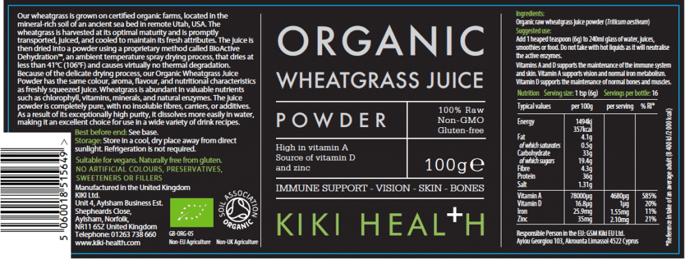 Kiki Health's Organic Wheatgrass Juice Powder is an easy to use alternative to fresh wheatgrass and contains fibre, which is often lost when juicing fresh wheatgrass. It has the same colour, aroma, flavour, and nutrients as freshly squeezed juice.