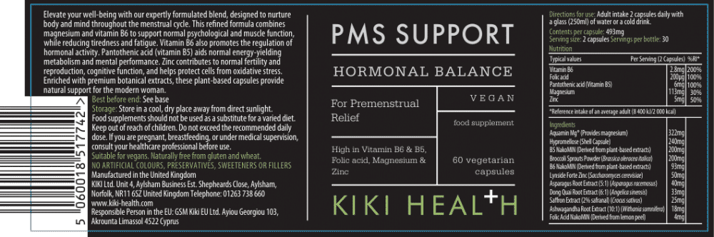 KIKI Health PMS Support is a plant-based formula designed to nurture body and mind throughout the menstrual cycle. With magnesium, zinc, and vitamins B5, B6, and folic acid, it helps regulate hormonal activity, reduce tiredness and fatigue, and support overall well-being.