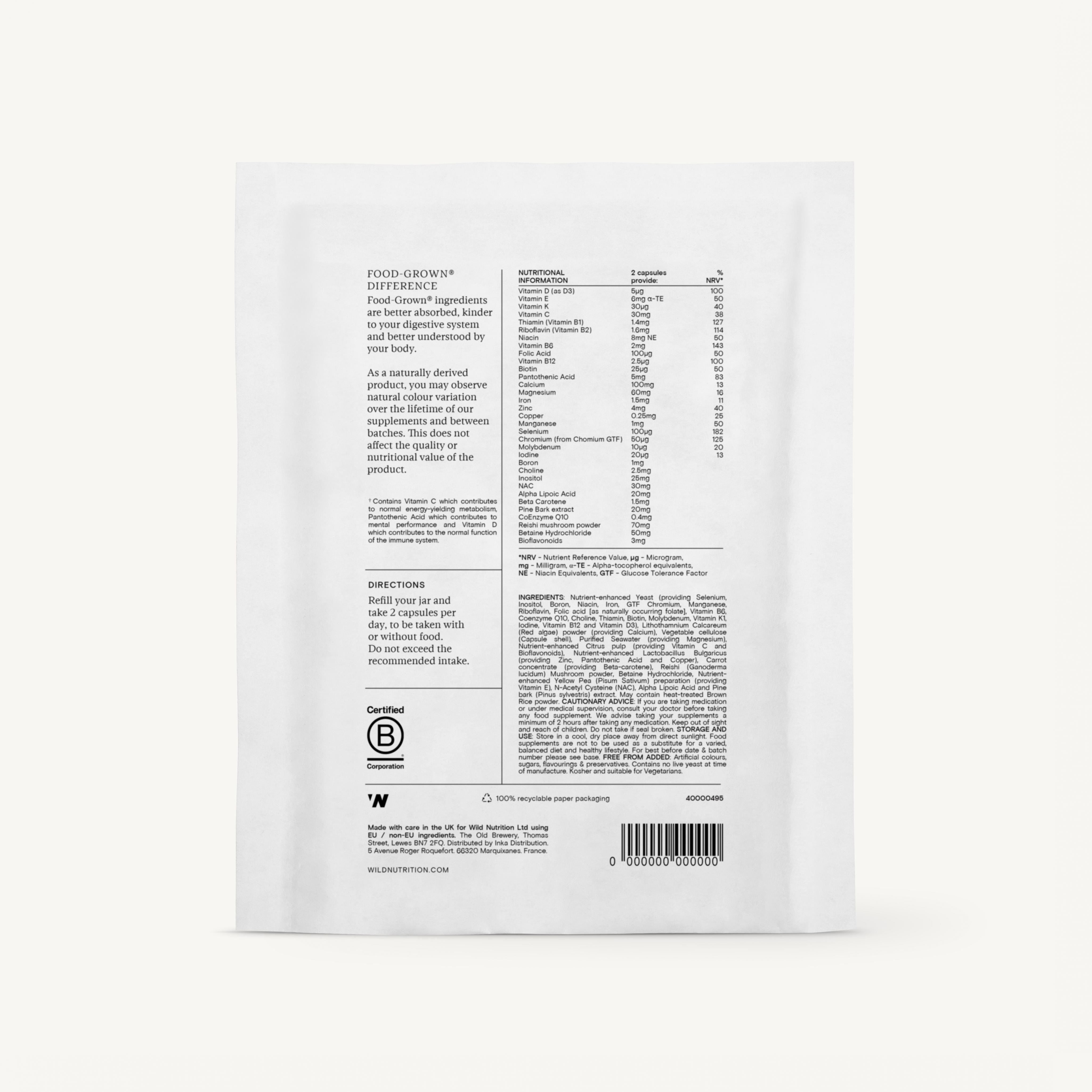 Nutrient-enhanced Yeast (providing Selenium, Inositol, Boron, Niacin, Iron, GTF Chromium, Manganese, Riboflavin, Folic acid [as naturally occuring folate], Vitamin B6, Coenzyme Q10, Choline, Thiamin, Biotin, Molybdenum, Vitamin K1, Iodine, Vitamin B12 and Vitamin D3), Lithothamnium Calcareum (Red algae) powder (providing Calcium), Vegetable cellulose (Capsule shell), Purified Seawater (providing Magnesium), Nutrient-enhanced Citrus pulp (providing Vitamin C and Bioflavonoids), Nutrient-enhanced Lactobacillus Bulgaricus (providing Zinc, Pantothenic Acid and Copper), Carrot concentrate (providing Beta-carotene), Reishi (Ganoderma lucidum) Mushroom powder, Betaine Hydrochloride, Nutrient-enhanced Yellow Pea (Pisum sativum) preparation (providing Vitamin E), N-Acetyl Cysteine (NAC), Alpha Lipoic acid and Pine bark (Pinus sylvestris) extract