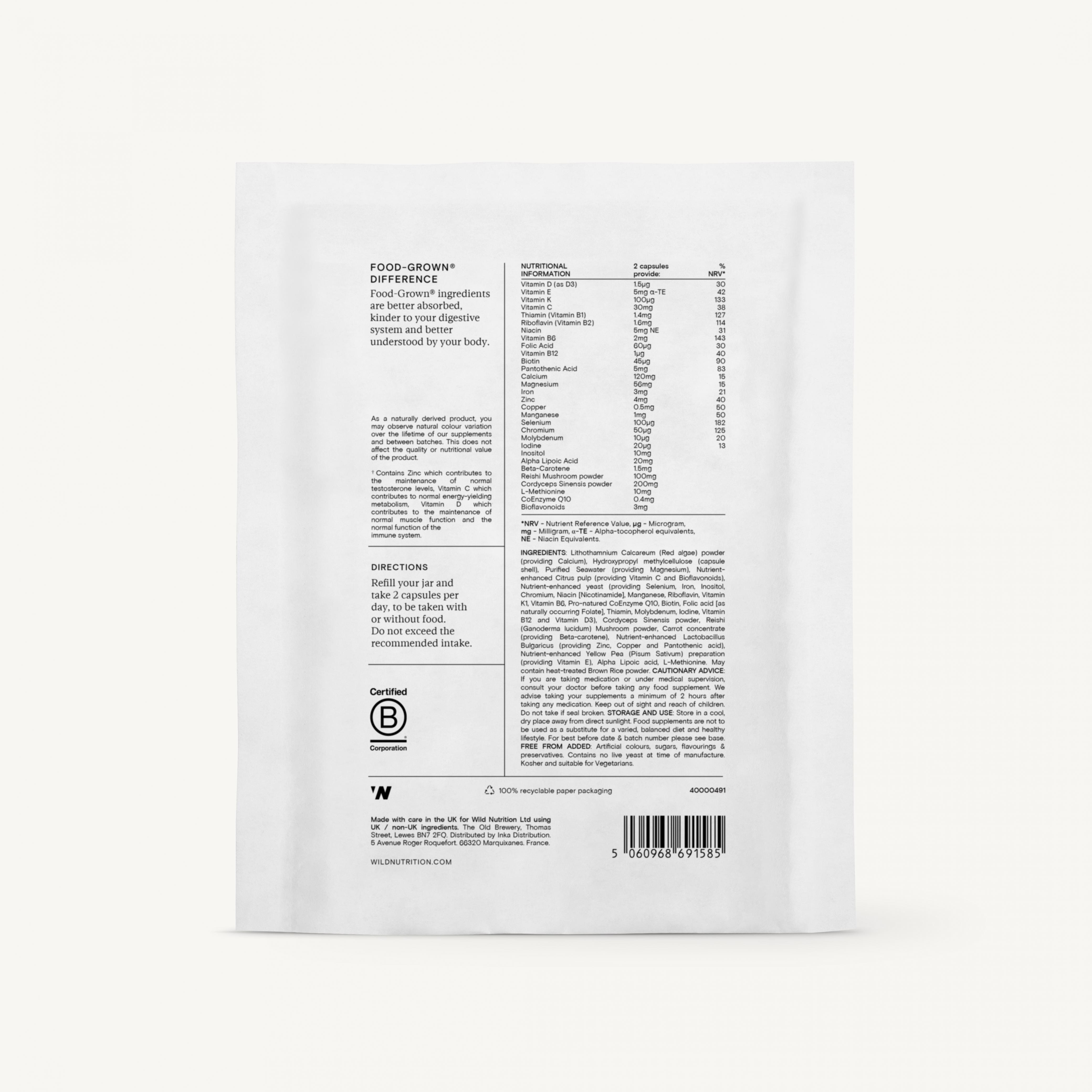 Lithothamnium Calcareum (Red algae) powder (providing Calcium) Nutrient- enhanced yeast (providing Selenium, Iron, Inositiol, Chromium GTF, Niacin, Manganese, Riboflavin, Vitamin K1, Vitamin B6, CoEnzyme Q10, Biotin, Folic acid [as naturally occuring Folate], Thiamin, Molybdenum, Iodine, Vitamin B12 and Vitamin D3), Nutrient-enhanced Lactobaccillus Bulgaricus (providing Magnesium, Zinc, Copper and Pantothenic acid), Vegetable cellulose (capsule shell), Nutrient-enhanced Citrus pulp (providing Vitamin C), Cordyceps sinensis powder, Reishi (Ganoderma lucidum) Mushroom powder, Carrot concentrate (providing Beta-carotene), Nutrient-enhanced Yellow Pea (Pisum Sativum) preparation (providing Vitamin E) and Alpha Lipoic acid