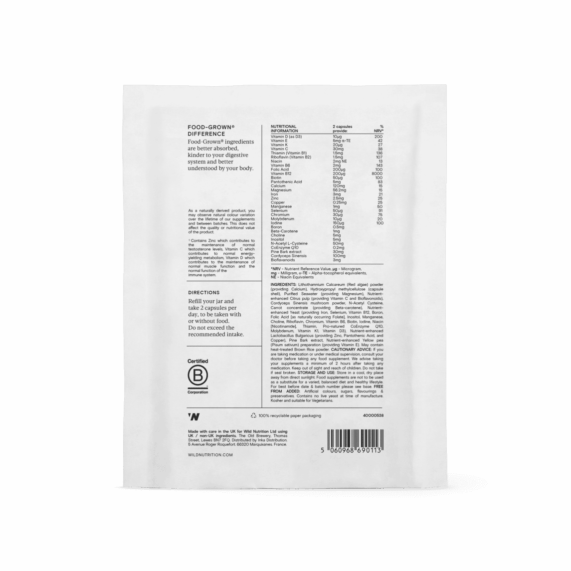 Two capsules taken together any time of day with or without food. Wild Nutrition nutrients are made from food, so you don’t need to take them with a meal.