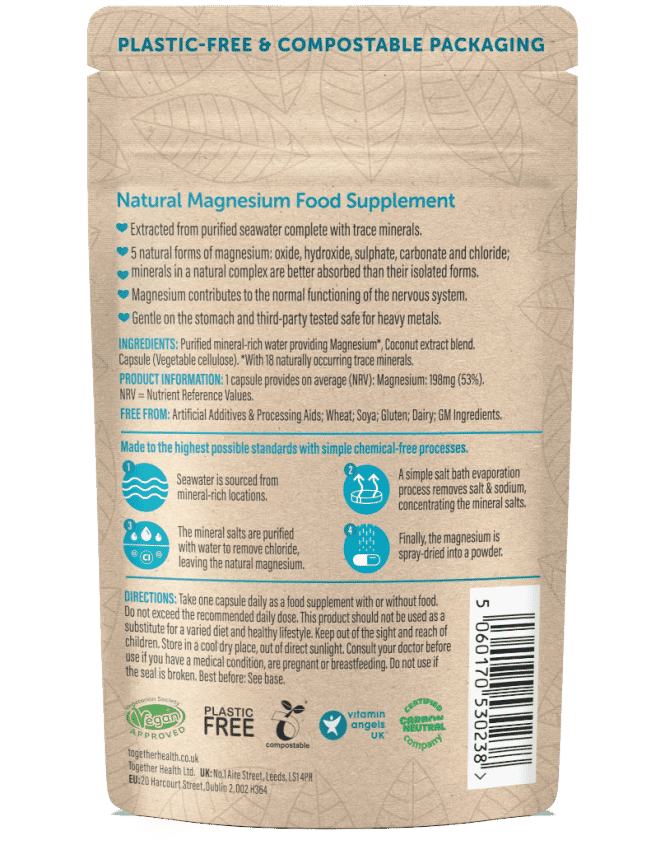 This magnesium supplement is complete. It contains all 5 natural forms of magnesium: oxide, hydroxide, sulfate, carbonate and chloride. Our bodies can easily recognise minerals when they’re taken from natural sources rather than synthetically created, so that’s exactly what Together Health have done
