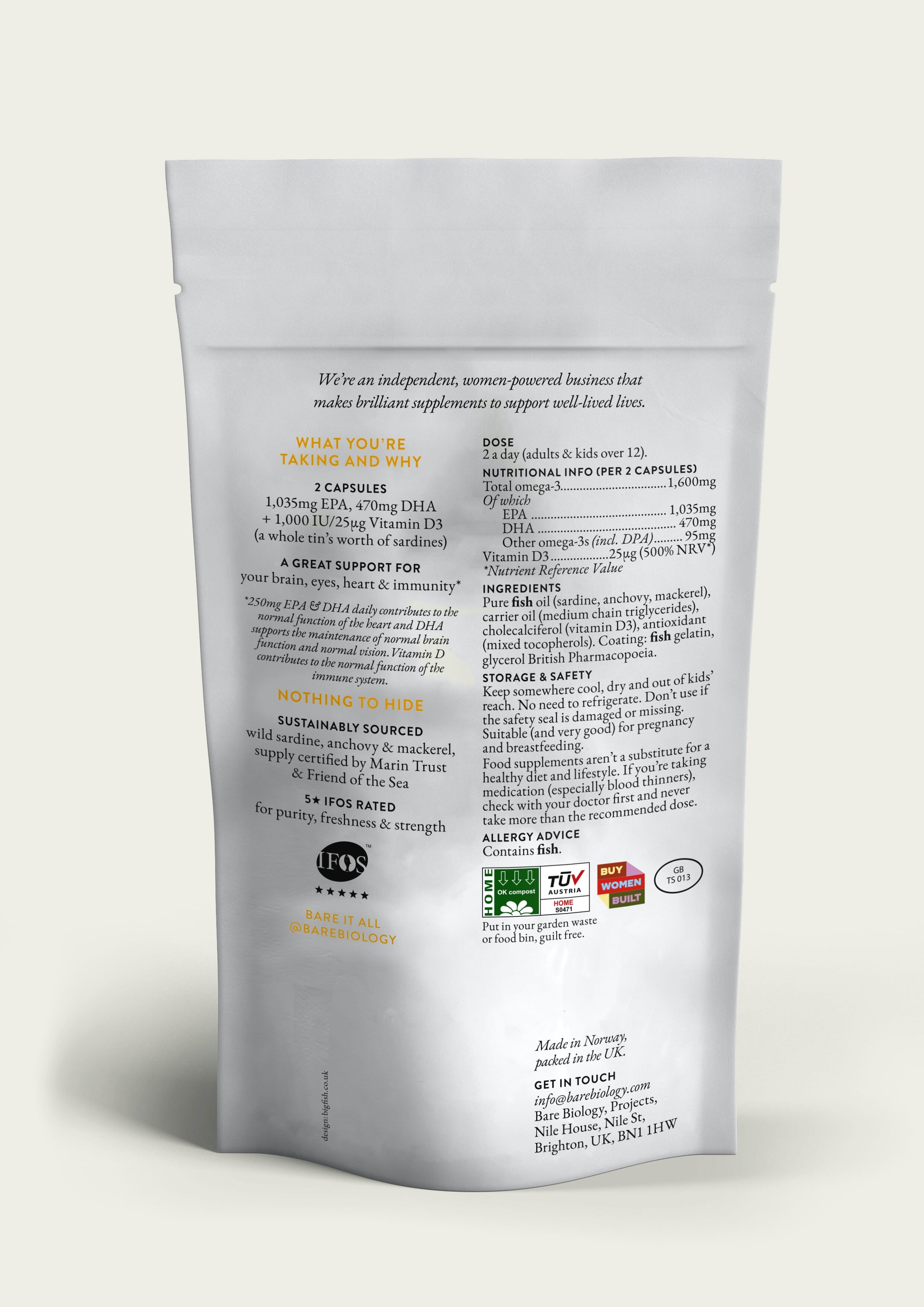 Pure fish oil (sardine, anchovy, mackerel), carrier oil (medium chain triglycerides), cholecalciferol (vitamin D3), antioxidant (mixed tocopherols) Coating: fish gelatin, glycerol British Pharmacopoeia.