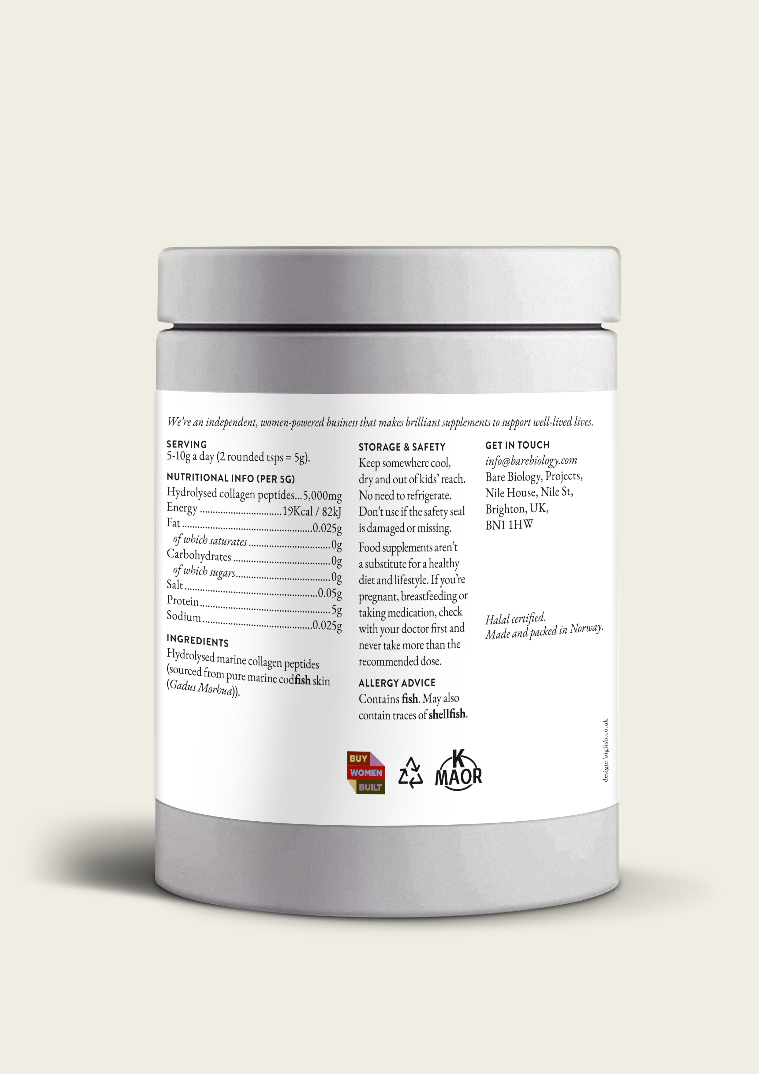 Bare Biology recommend 5g (or 5000mg) a day, which is roughly two heaped teaspoons. Some brands say you need at least 10g a day but customers have reported benefits with 5g a day, which means a pot will last two months.