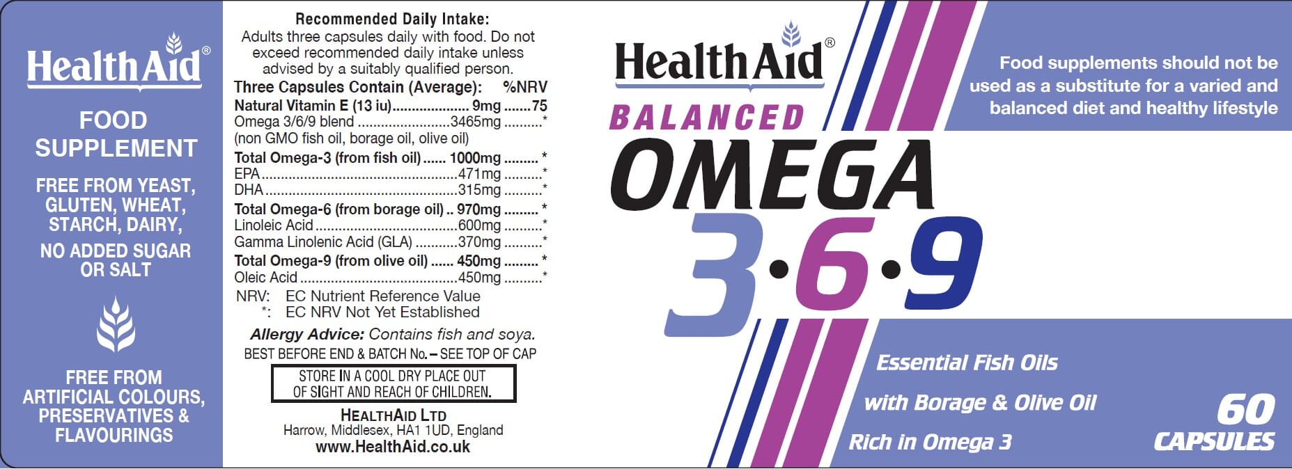 Omega 3.6.9 Capsules contain essential fatty acids from Borage Oil (highest source of GLA), Olive Oil (Omega 9) & high in EPA & DHA Fish Oil, beneficial for cardiovascular health, immunity, brain and muscle function, healthy growth and development, as well as maintenance of healthy looking skin.