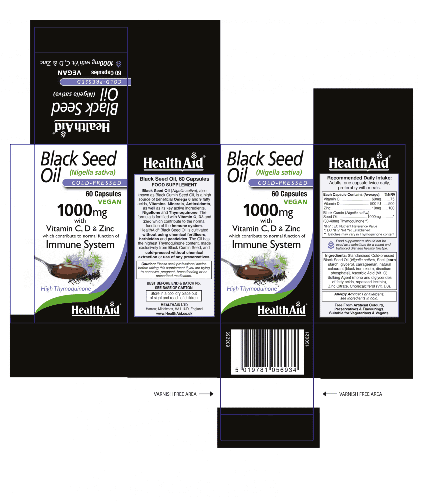 Standardised Cold-pressed Black Seed (Nigella sativa) Oil, Capsule Shell [corn starch, glycerol, carrageenan, natural colourant (black iron oxide), disodium phosphate], Ascorbic Acid (Vit. C), Bulking Agent (mono and diglycerides of fatty acids, rapeseed lecithin), Zinc Citrate, Cholecalciferol (Vit. D3 – vegan source)