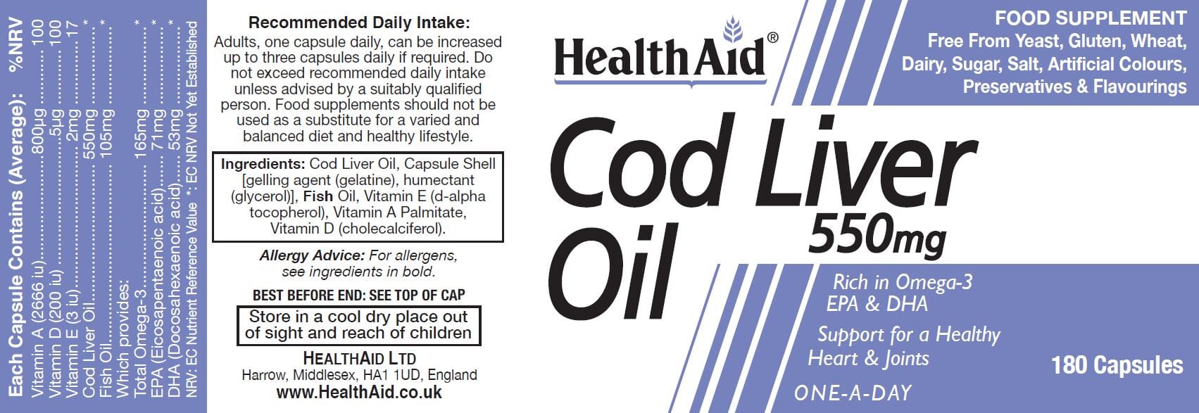 Cod Liver Oil is a rich source of Omega 3, Vitamin A & D. It is beneficial for maintaining a healthy cardiovascular & nervous system; and supporting healthy bones & joints. HealthAid Cod Liver Oil is virtually free of all impurities, enriched with Vitamin E; cold pressed and hermetically sealed.