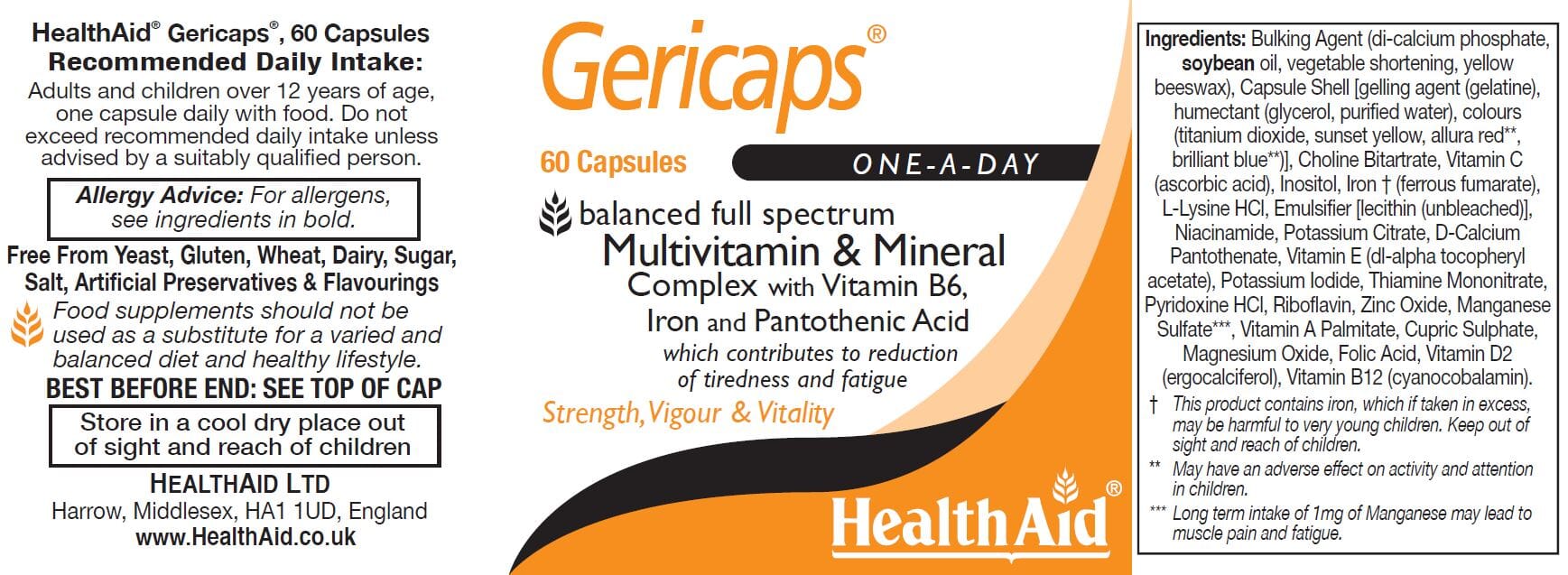 A highly potent and uniquely balanced combination of natural vitamins, minerals and trace elements. HealthAid Gericaps are important to revitalise the body, enable a more active lifestyle, maximise energy levels, and contribute to the reduction of stress and fatigue.
