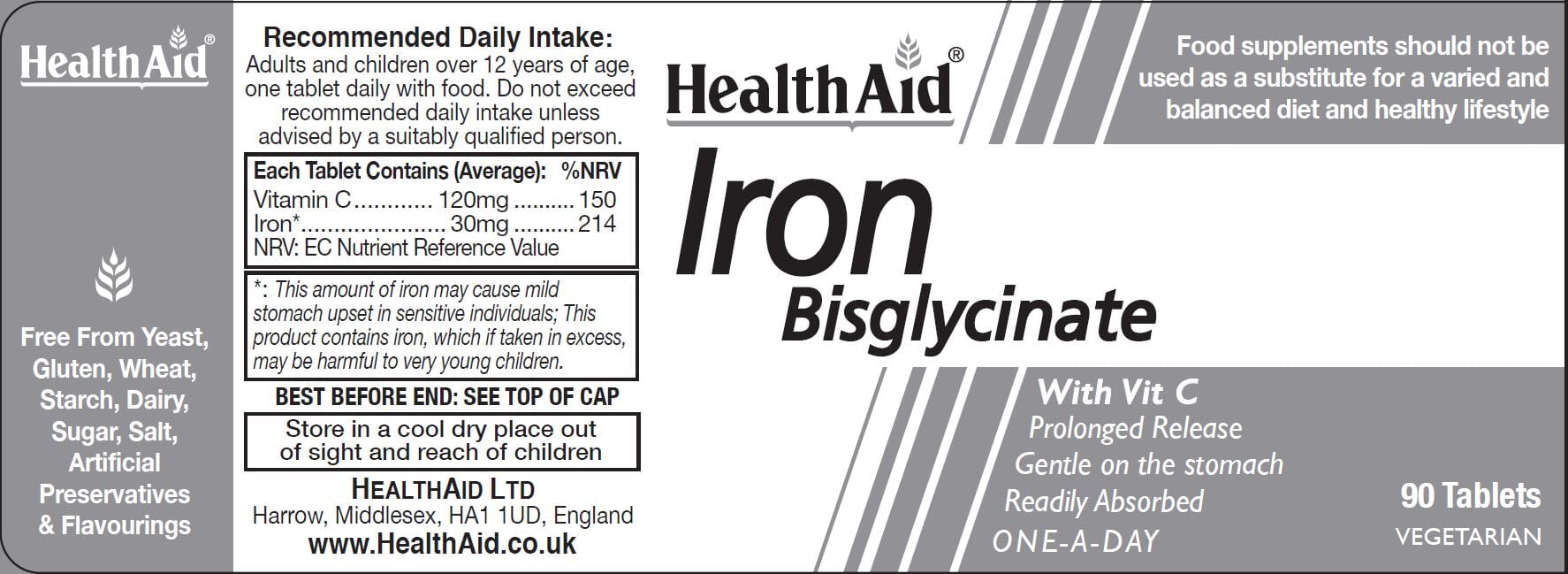 Vitamin C (ascorbic acid), Iron (ferrous bisglycinate), Bulking Agent (di-calcium phosphate, microcrystalline cellulose), Anti-caking Agent (veg. stearic acid, veg. magnesium stearate, magnesium silicate), Glazing Agent ((hypromellose, polyvinylpyrrolidone (PVP), natural colours (titanium dioxide, iron oxide)).