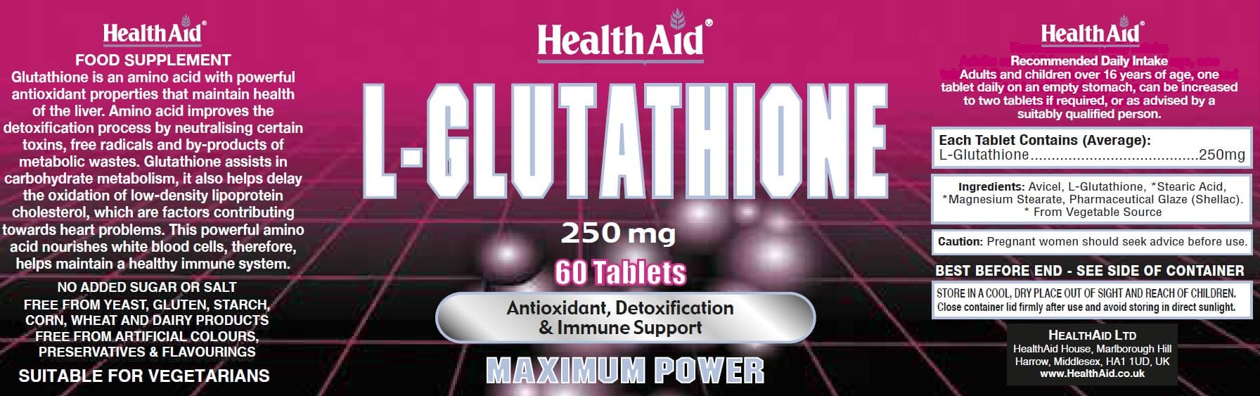 L-Glutathione is regarded as the most powerful of all antioxidants. It supports detoxification & liver health, strong immunity, neutralises free radicals, promotes carbohydrate metabolism, and helps delay the oxidation of low- density lipoprotein cholesterol supporting a healthy heart.
