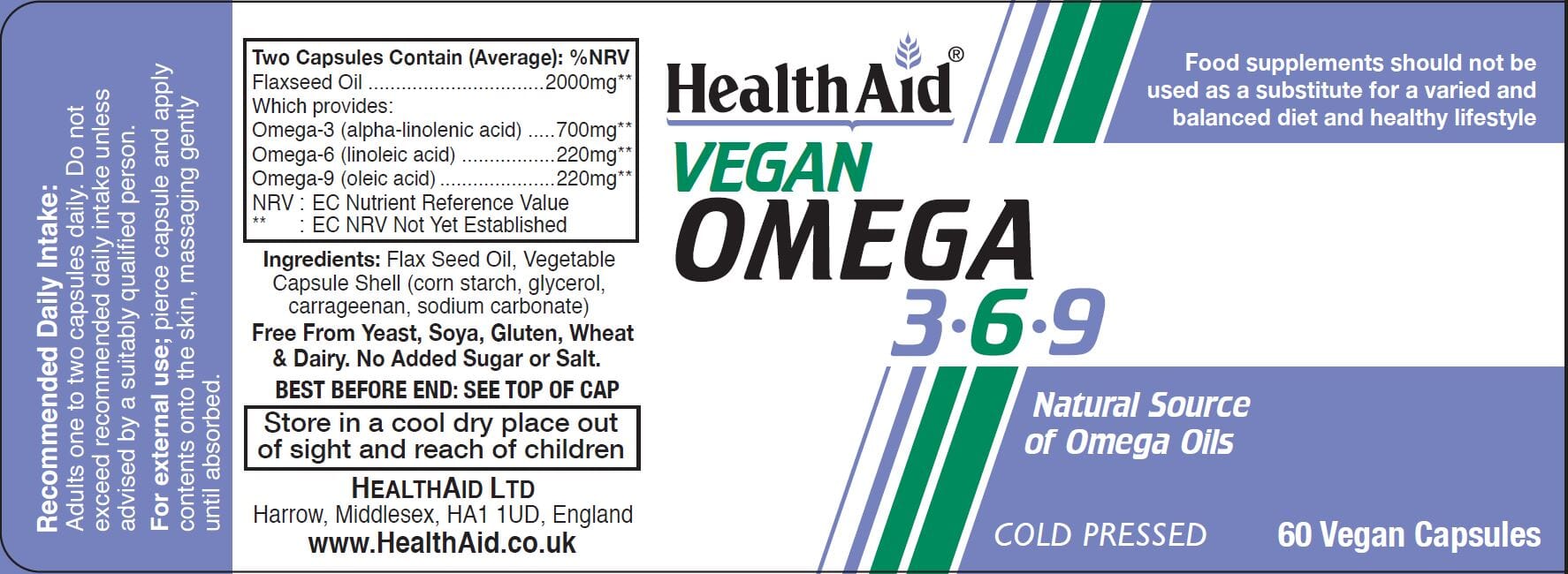 HealthAid® Vegan Omega 3-6-9 is sourced from the plant Flax Seed Oil, a rich natural source of high quality polyunsaturated and essential fatty acids Omega-3, Omega-6 and Omega-9. The amounts of each fatty acid in Vegan Omega 3-6-9 are perfectly balanced to achieve an optimum healthy levels.