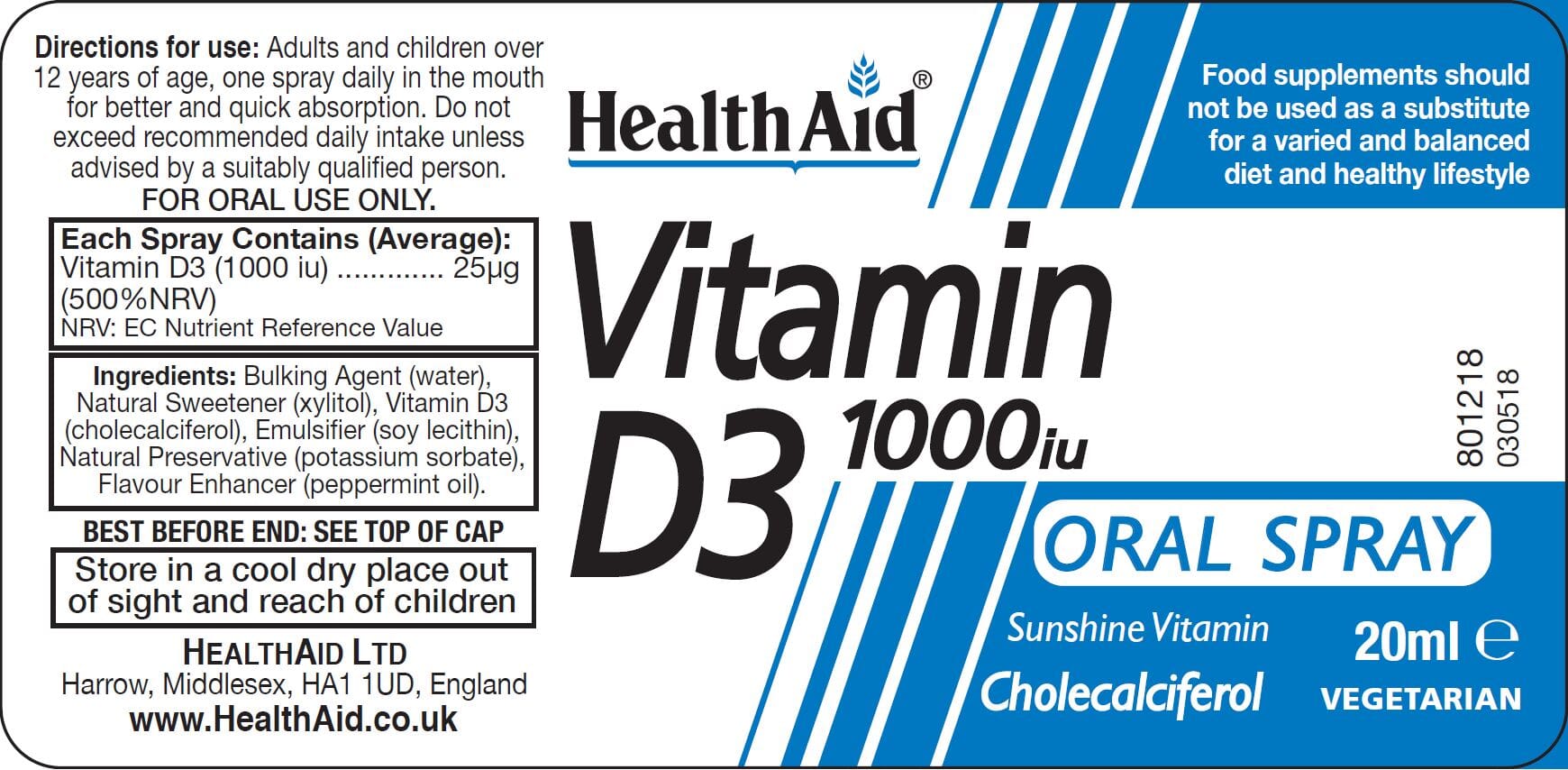 Vitamin D3 (cholecalciferol), Bulking Agent (water), Natural Sweetener (xylitol), Emulsifier (soy lecithin), Natural Preservative (potassium sorbate), Flavour Enhancer (peppermint oil).