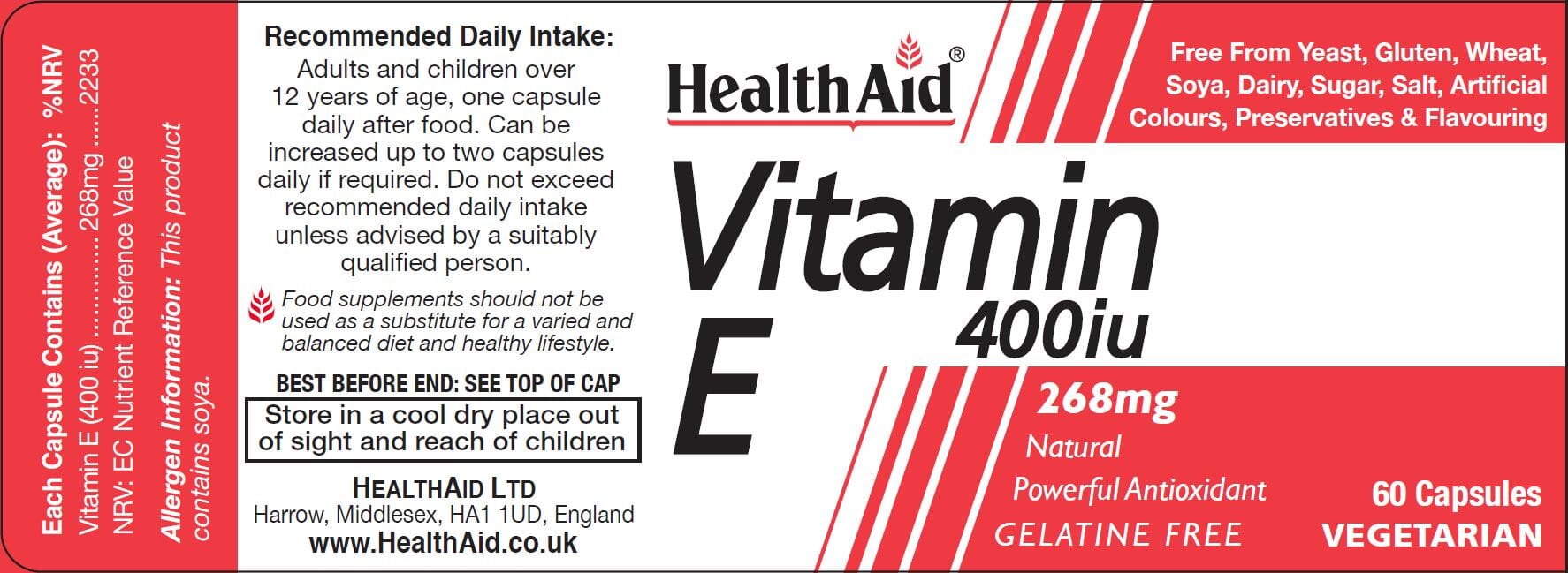 Vitamin E functions as a powerful antioxidant and contributes to the protection of cells from oxidative stress. Oxidation of cells is a process connected to cellular ageing, HealthAid provides a natural source of Vitamin E in a high potency easy to swallow soft capsule for maximum benefit.