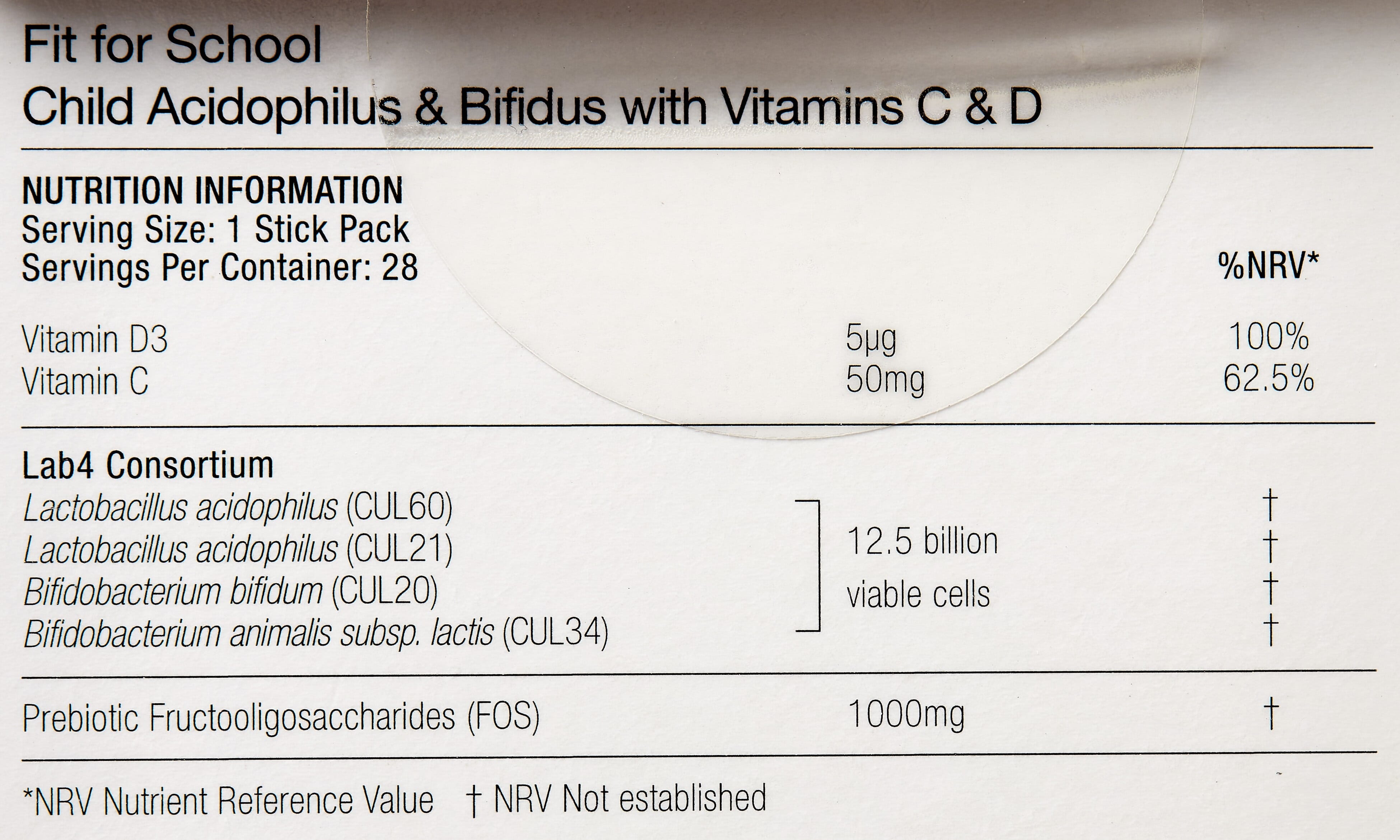Fit for School stick packs are provided as single one-a-day powder sachets that can be taken straight from the pack or are easy to add to food or drink.