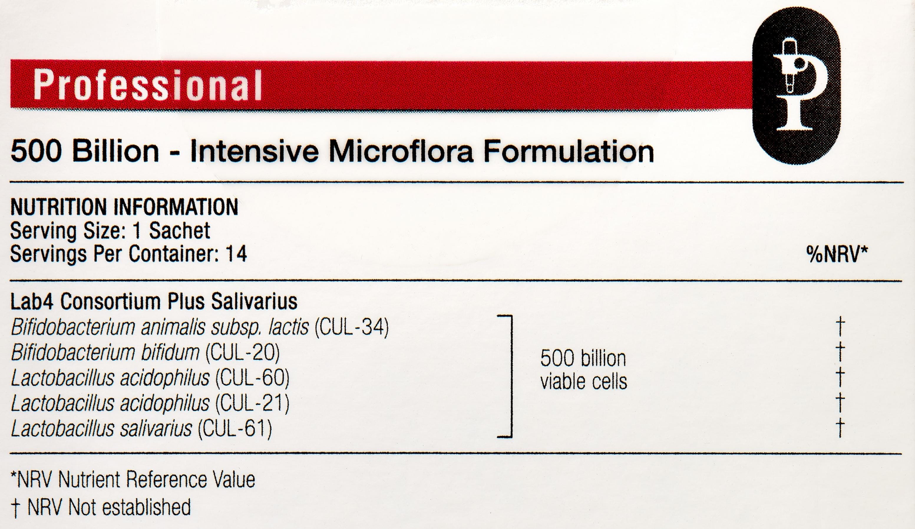 Professional 500 Billion provides an intensively concentrated intake of the clinically studied Lab4 consortium of live bacteria combined with Lactobacillus salivarius, which following intake has been found to have an extended residence time in the large intestine.