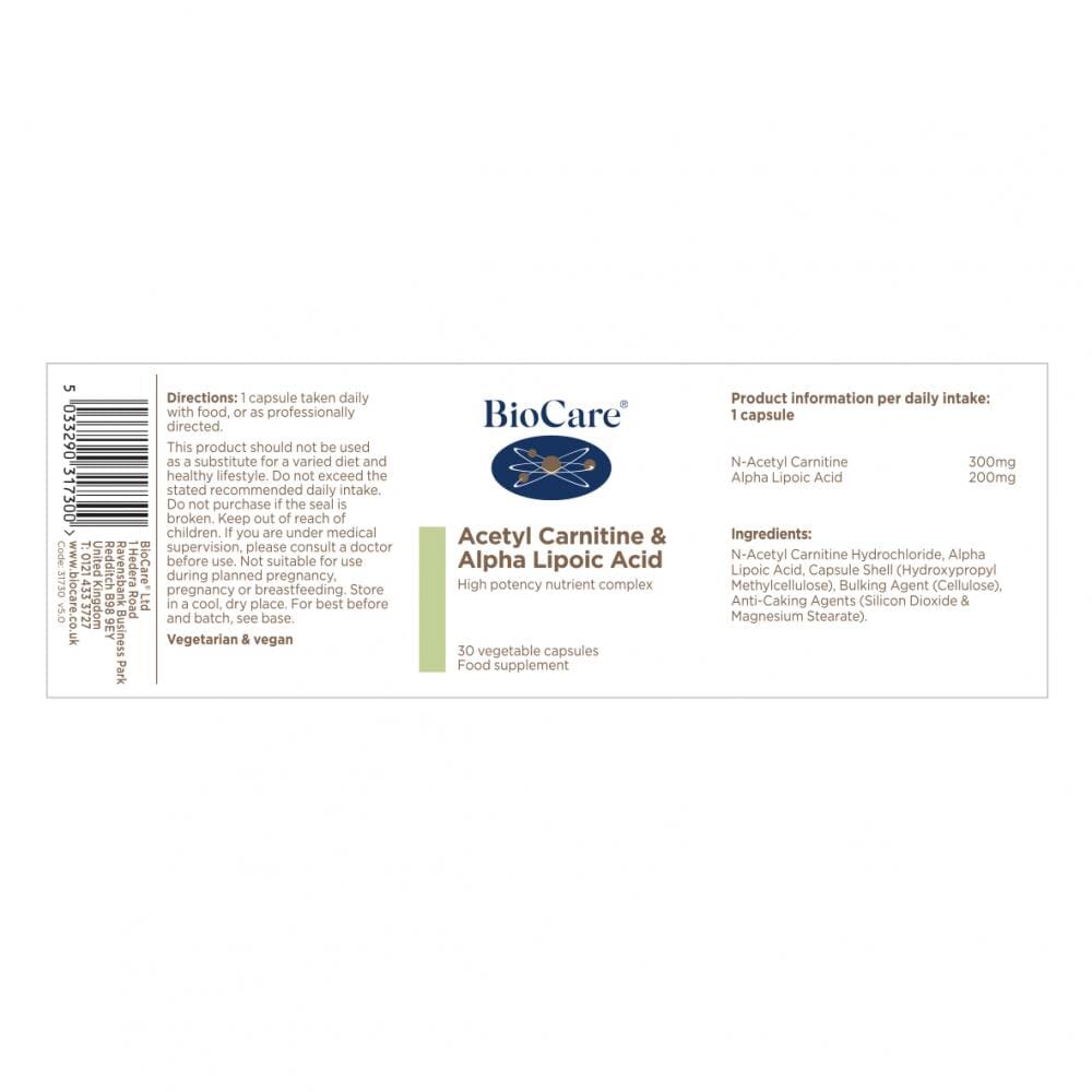 This Acetyl Carnitine & Alpha Lipoic Acid formulation provides 300mg N-acetyl carnitine and 200mg alpha lipoic acid in a vegetarian and vegan friendly capsule.