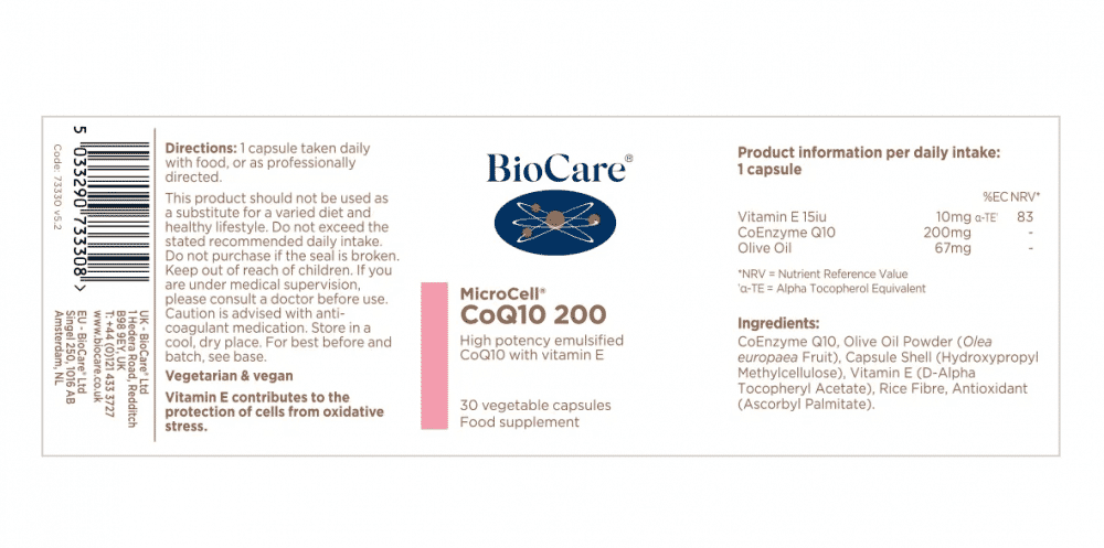CoEnzyme Q10, Olive Oil (Olea europaea Fruit), Capsule Shell (Hydroxypropyl Methylcellulose), Vitamin E (D-Alpha Tocopheryl Acetate), Rice Fibre, Antioxidant (Ascorbyl Palmitate)