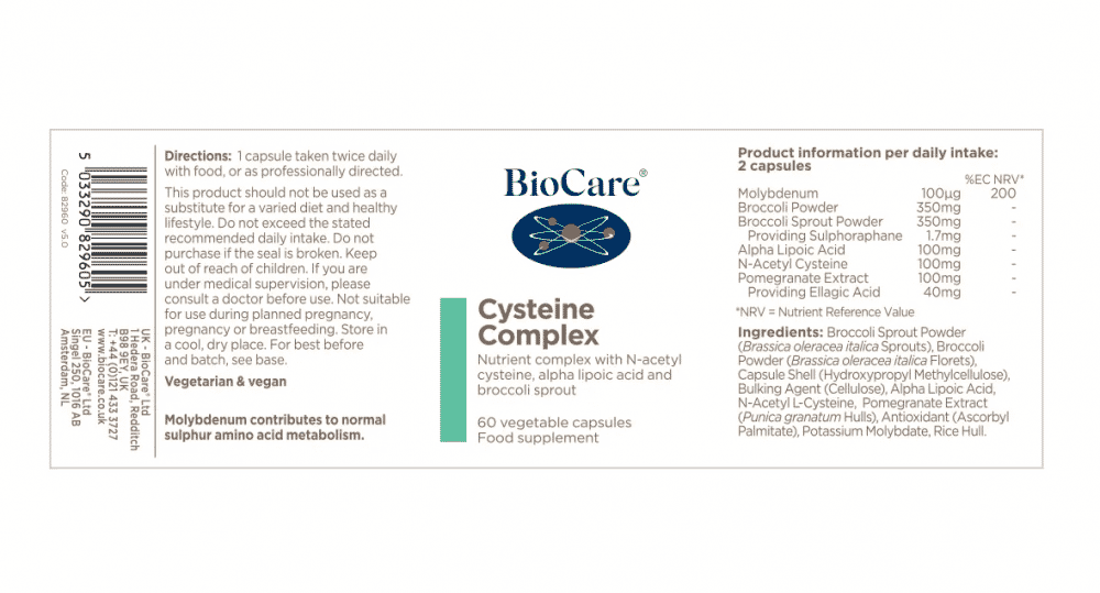 Cysteine Complex is a unique combination of nutrients including N-acetyl cysteine, alpha lipoic acid and broccoli sprout.