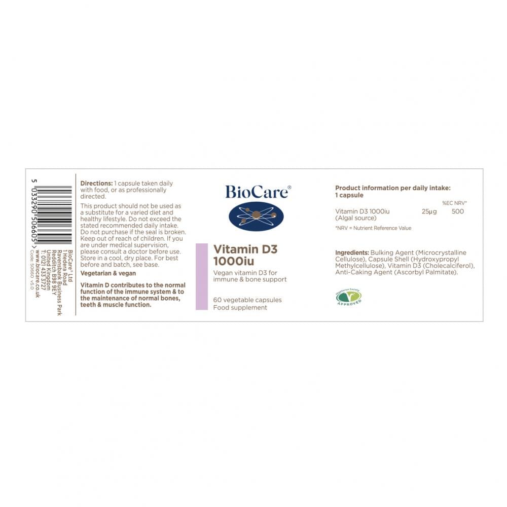 High potency vegan vitamin D3, providing 1000iu vitamin D per capsule for immune and bone support.