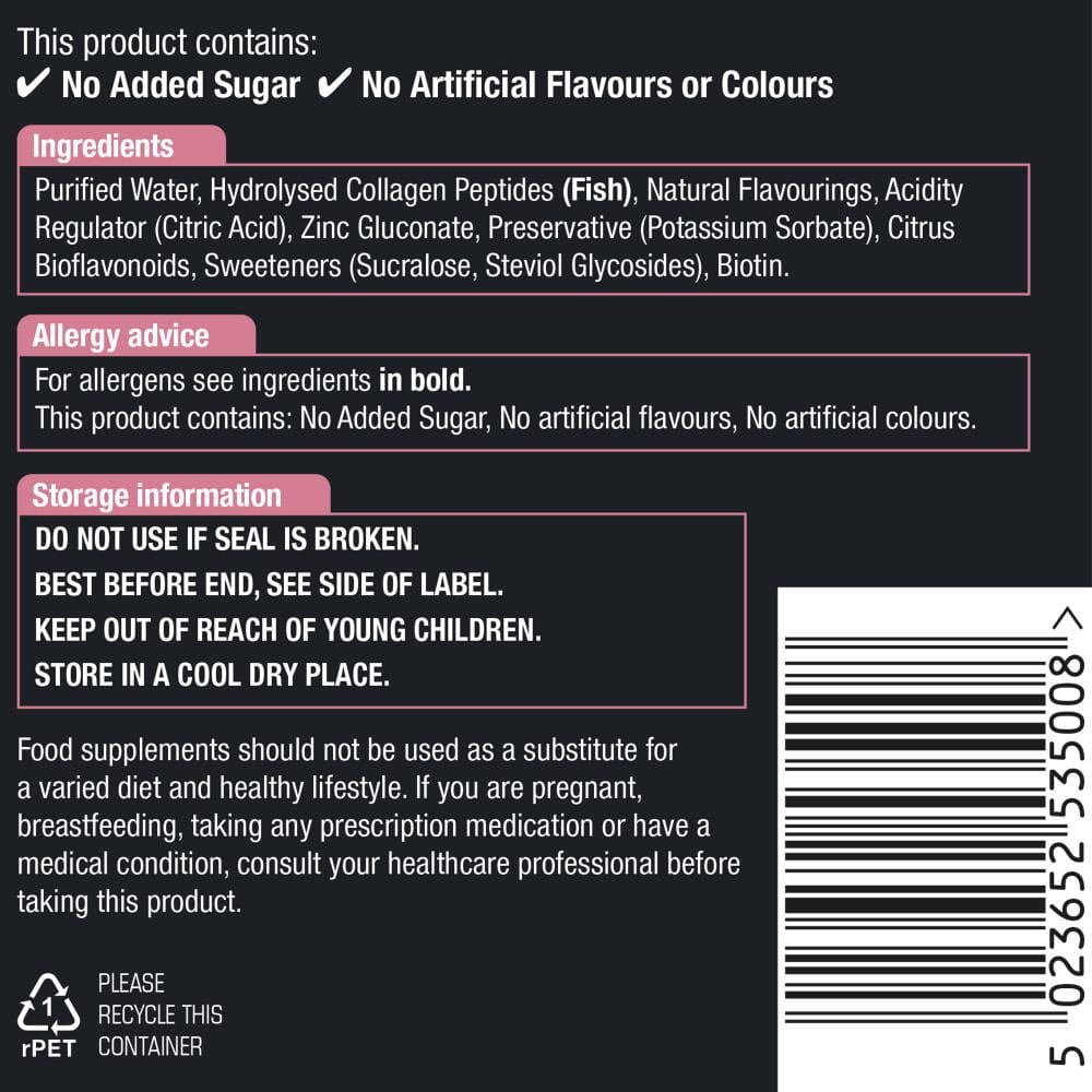 Purified Water, Hydrolysed Collagen Peptides (Fish), Natural Flavourings, Acidity Regulator (Citric Acid), Zinc Gluconate, Preservative (Potassium Sorbate), Citrus Bioflavonoids, Sweeteners (Sucralose, Steviol Glycosides), Biotin.