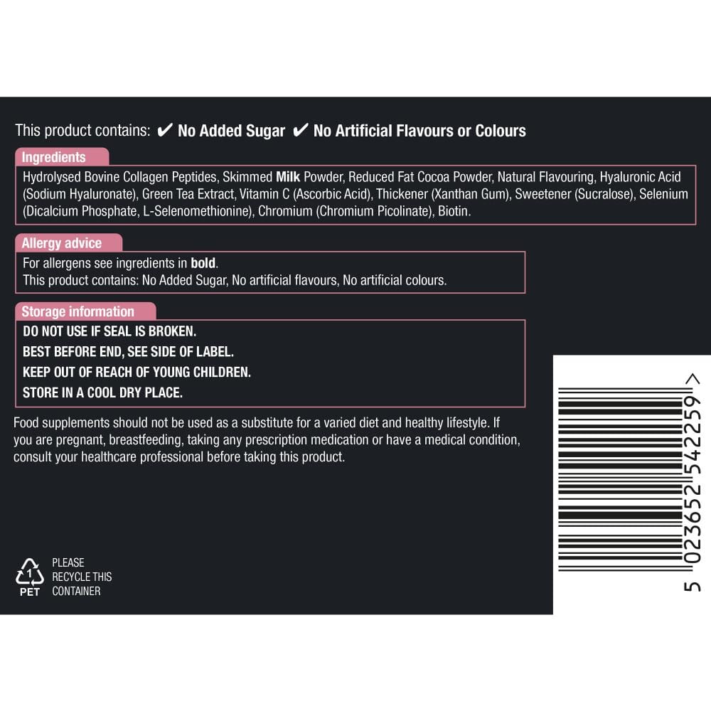 Hydrolysed Bovine Collagen Peptides, Skimmed Milk Powder, Reduced Fat Cocoa Powder, Natural Flavouring, Hyaluronic Acid (Sodium Hyaluronate), Green Tea Extract, Vitamin C (Ascorbic Acid), Thickener (Xanthan Gum), Sweetener (Sucralose), Selenium (Dicalcium Phosphate, L-Selenomethionine), Chromium (Chromium Picolinate), Biotin.