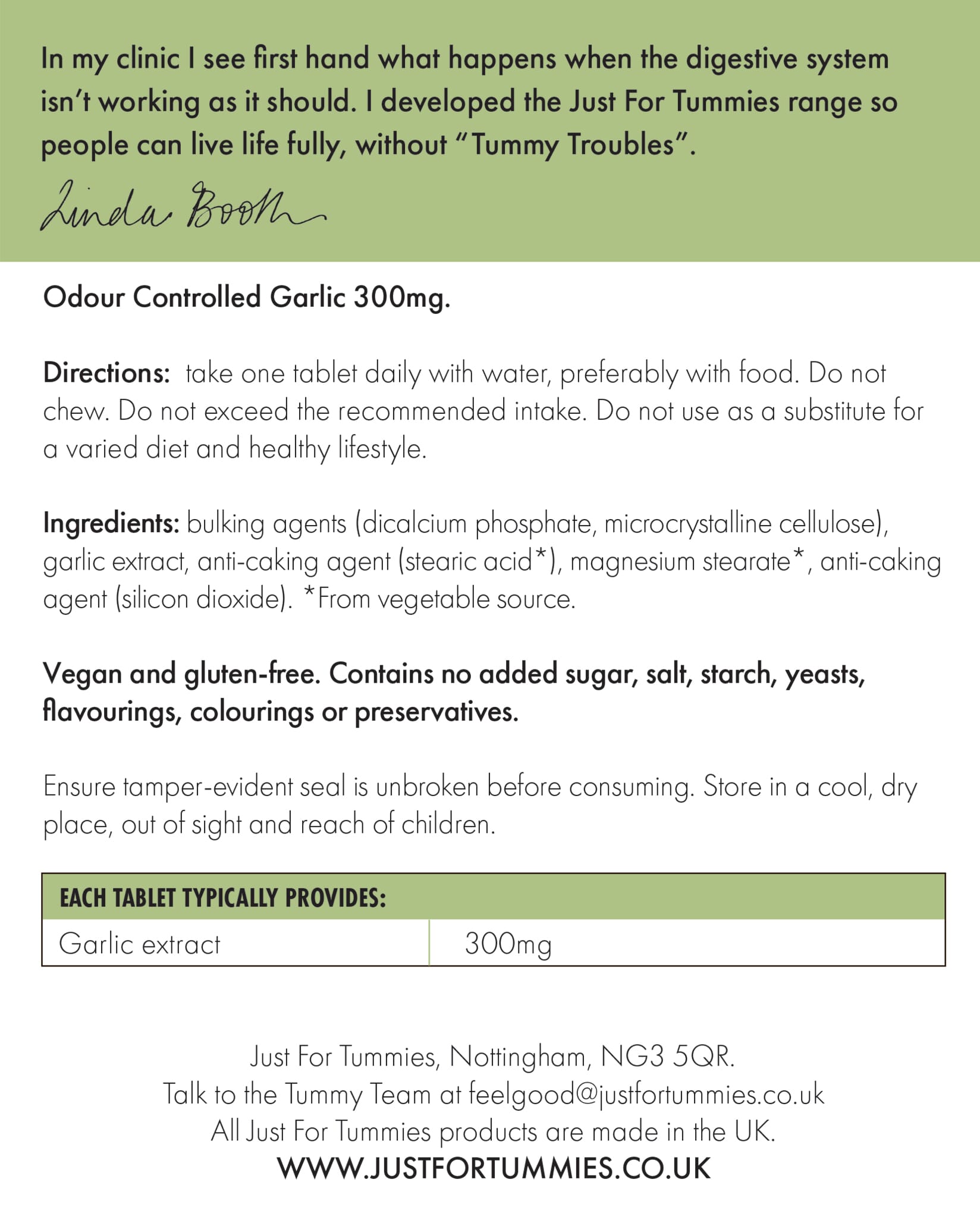 Linda’s Just For Tummies odourless Garlic Tablets are high strength yet thankfully low-odour. They are made from pure, aged garlic extract and have been used traditionally to help maintain a healthy digestive system and gut.