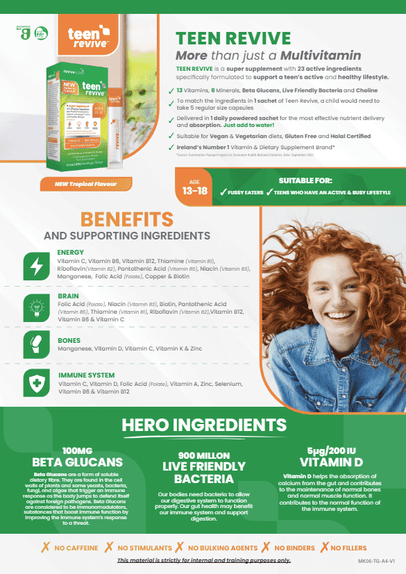 A blend of 23 premium nutrients, this comprehensive tropical flavoured powdered formula delivers a synergistic, multi-pronged approach in gut, immune, bone and brain health, for a growing body's demands! Nutrients focus on energy for busy teenagers to thrive, supporting active lifestyles. Age 13-18