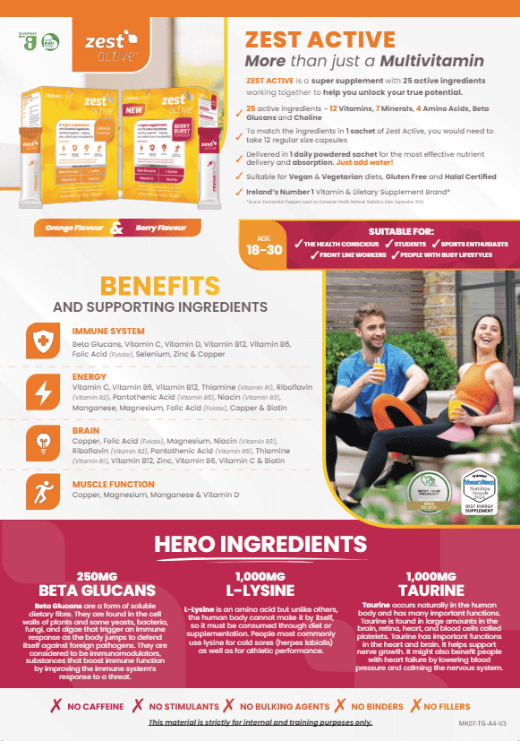 Zest Active. Advanced premium multi-nutrient powder formulation designed to deliver a synergistic approach to brain and muscle function, energy and immunity. Includes Beta glucans, L-lysine, L-theanine, taurine, L-glutamine, choline and biotin, vitamins and minerals. Fusion of 25 active ingredients!