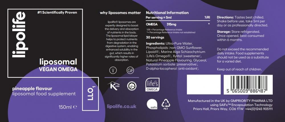 A vegan omega supplement, an alternative to traditional fish oils in a highly absorbable form. lipolife enhance the absorption of active nutrients by employing liposomal encapsulation. Surrounding the omega in phospholipids, uptake can be improved throughout the body.