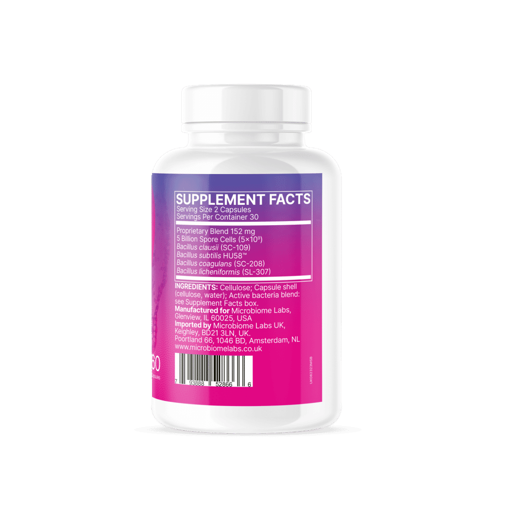 Active bacterial blend: Bacillus subtilus (HU58), Bacillus coagulans (SC-208), Bacillus Clausii (SC-109), Bacillus licheniformis (SL-307), Cellulose, Capsule Shell (Cellulose, water)