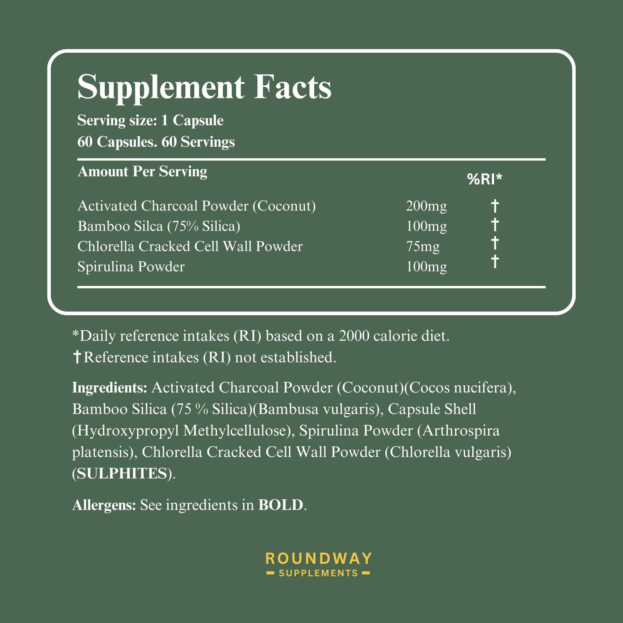 Roundway Supplements Full-Spectrum Binder Capsules combine activated charcoal, chlorella, spirulina, and bamboo-derived silica in a thoughtfully balanced formula. Each capsule is carefully crafted to support your wellness routine, often chosen for used in detox and cleansing programmes.