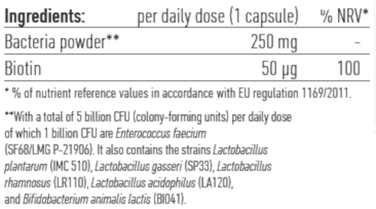 Take one capsule daily with plenty of liquid approx. 30 minutes before a meal. Take oral antibiotics and this food supplement 2–3 hours apart.