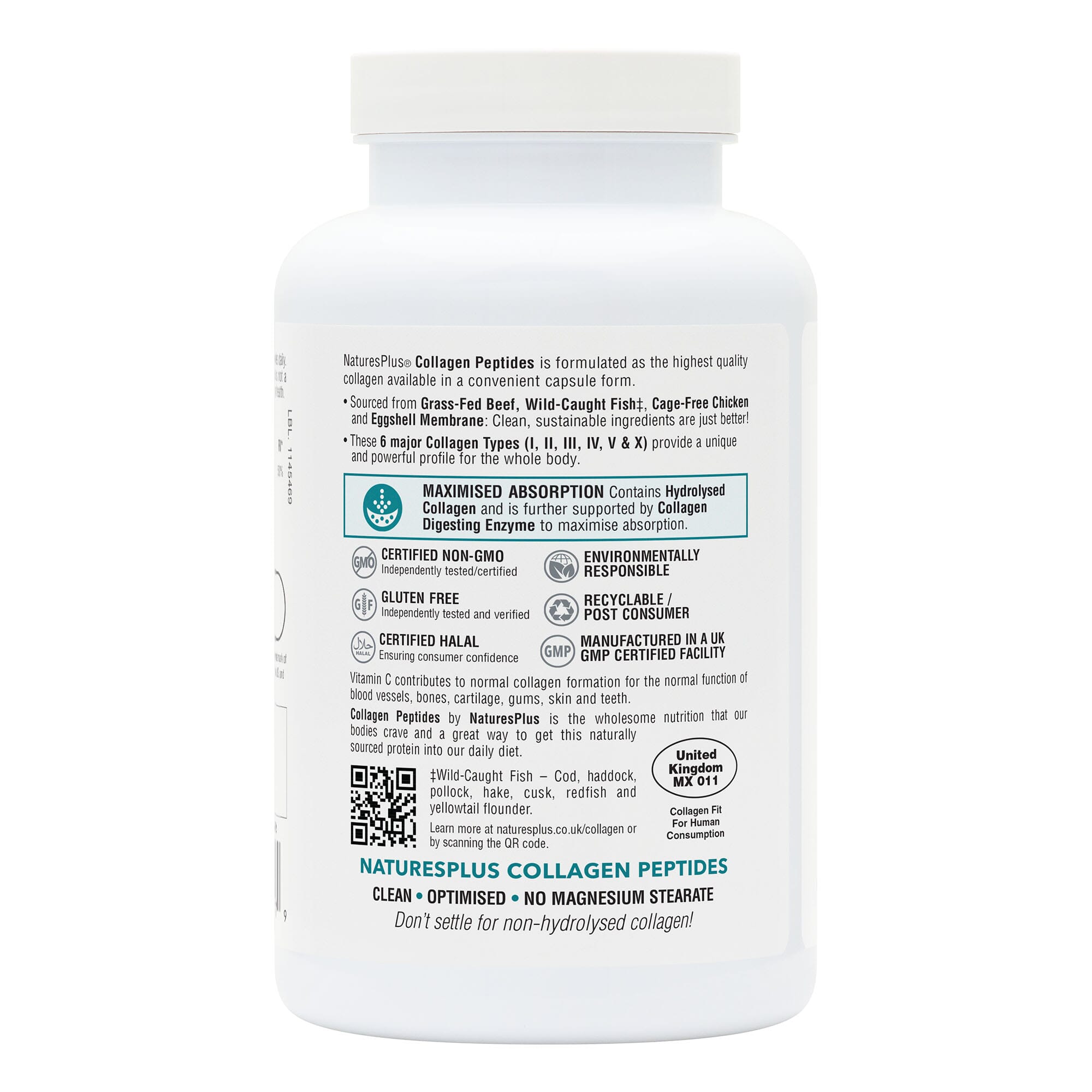 Collagen provides support to all tissues and systems of the body and is the primary structural protein, responsible for shape and strength. Collagen Peptides Capsules by NaturesPlus provides all 6 major collagen types (I, II, III, IV, V & X), a complete profile for the whole body.