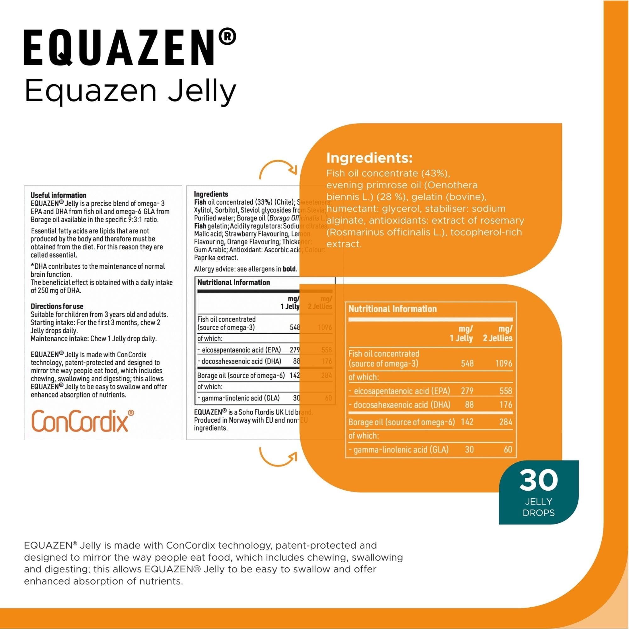 EQUAZEN® Jelly is a fruity flavoured combination of omega-3 and omega-6 fatty acids, made respectively from responsibly sourced fish oil and Borage oil.