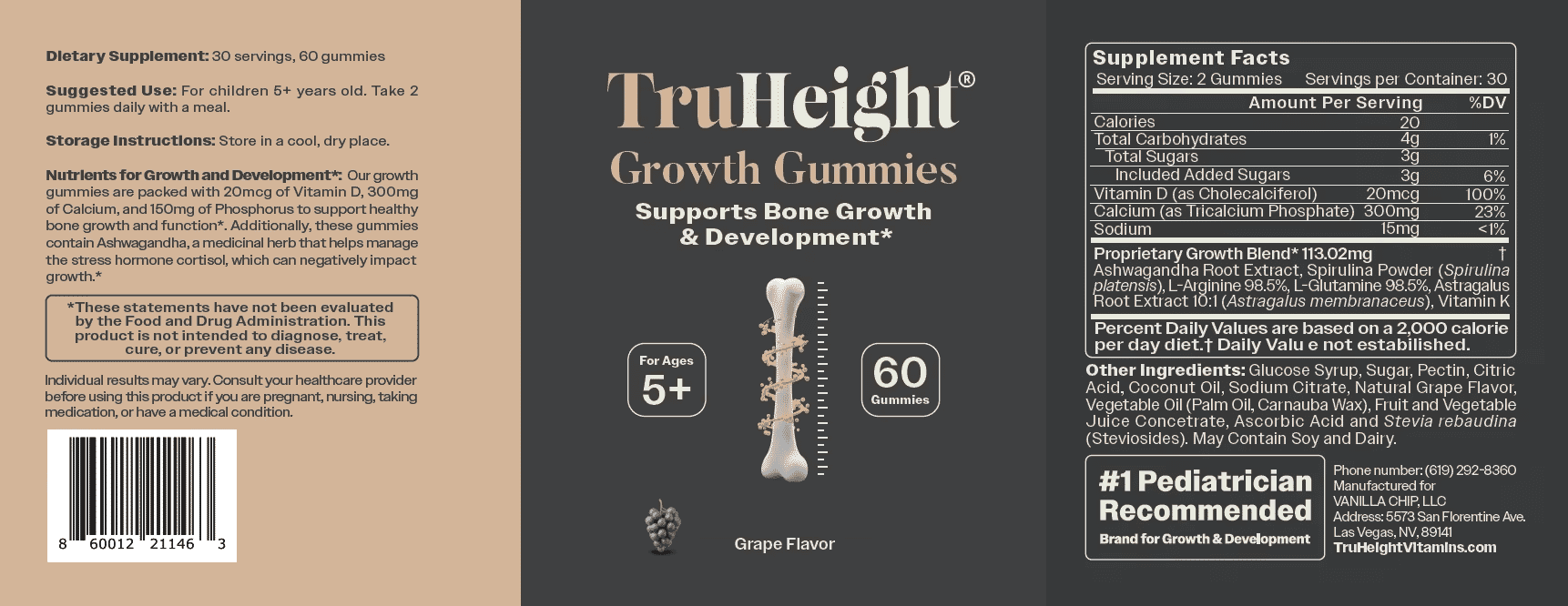 TruHeight® Grape Growth Gummies contain calcium and vitamin D, to stimulate bone growth and development. Also contains ashwagandha, a herb known to lower levels of stress, a common cause of stunted growth.