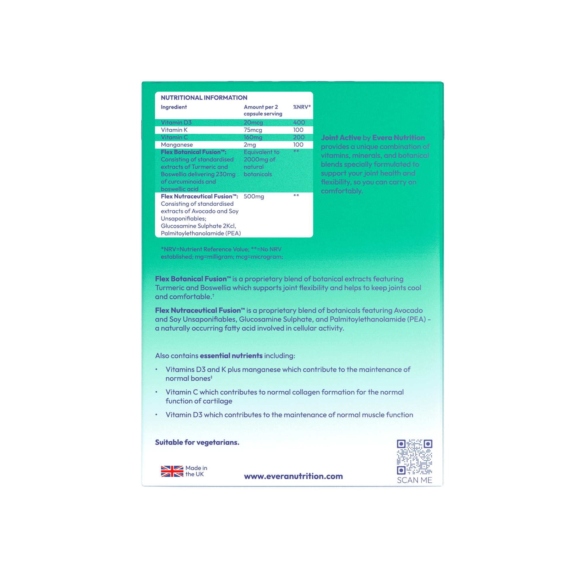 Joint Active by Evera Nutrition provides a unique combination of vitamins, minerals, and botanical blends specially formulated to support your joint health and flexibility, so you can carry on comfortably.