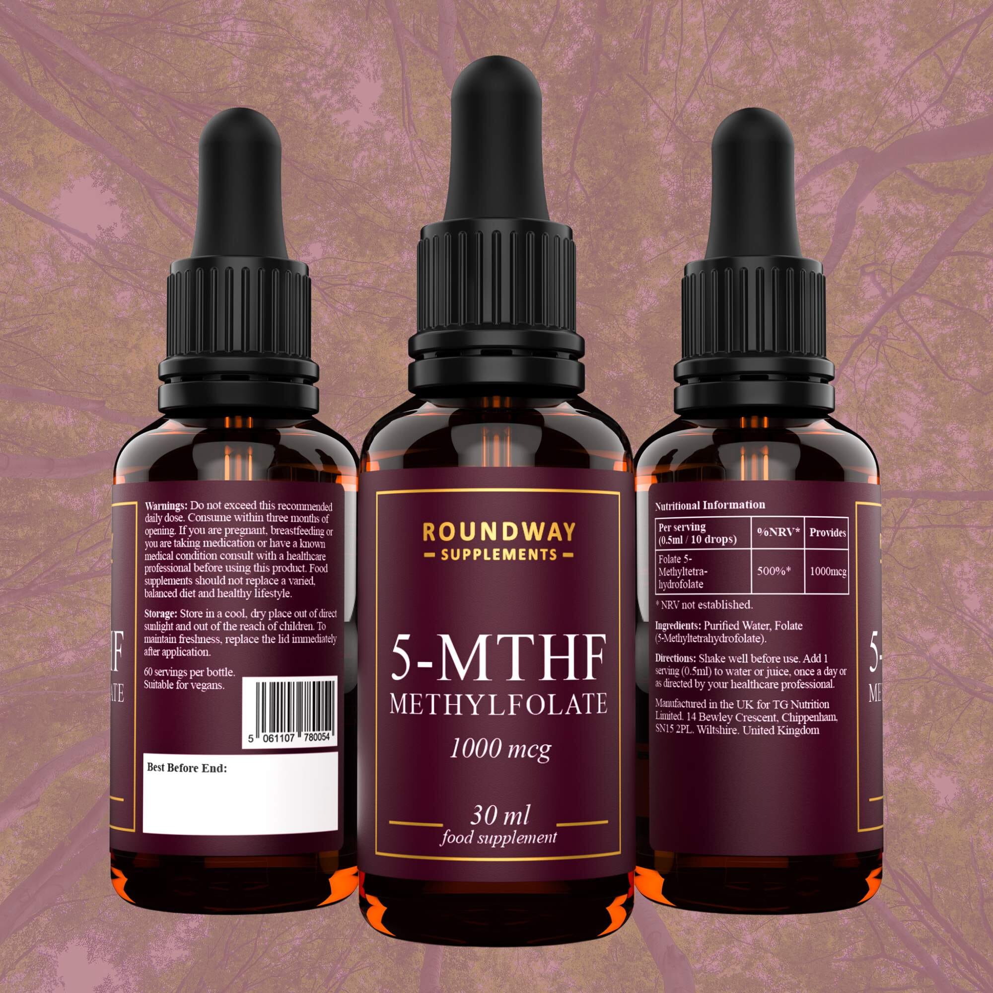 Roundway Supplements’ 5-MTHF Methylfolate Drops provide 1000mcg of folate per serving in a convenient liquid format. The formula uses 5-methyltetrahydrofolate (5-MTHF), the active form of folate, and is supplied with a measured pipette to allow simple and precise daily dosing.