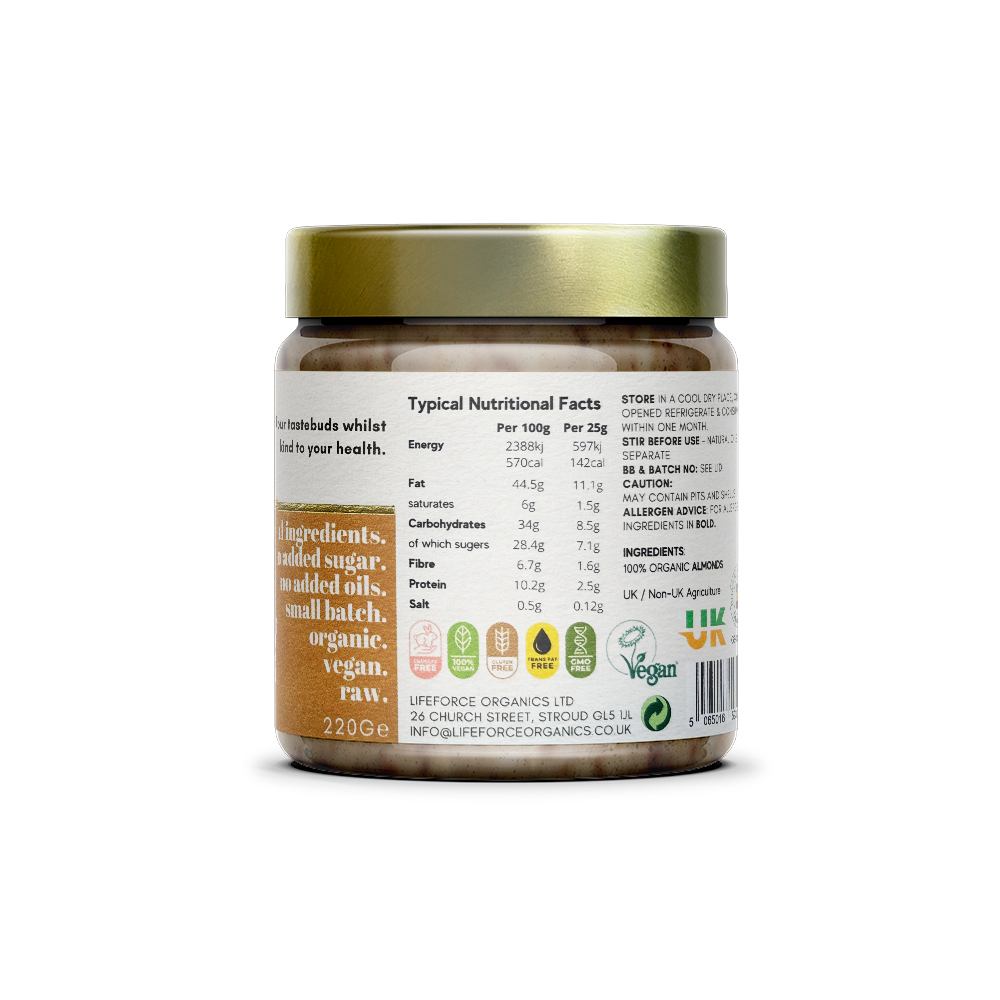 Single Origin, Organic Almonds, sustainably sourced to craft this Raw Activated Crunchy Almond Butter - a naturally sweet, creamy, stone-ground delicacy for health-conscious epicures. Elevate savoury and sweet dishes with this nutty spread - from smoothies and granola, to toast and dressings.