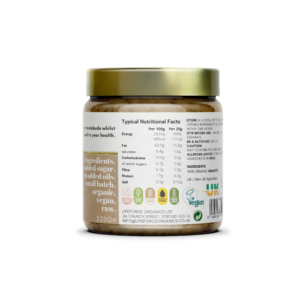 100% organic, raw Italian walnuts, rinsed and then soaked for 12 hours to start germination (activation). After dehydrating below 43°C to preserve their raw enzymatic qualities which are then gently stone ground, resulting in a nutritious and delicious, crunchy and moreish walnut butter.