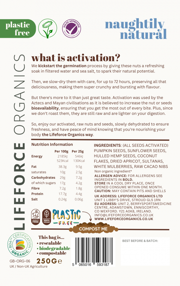These seeds have been rinsed and then soaked for 12 hours to start germination and activate them, this allows access to their full nutrient profile. Then they are mixed with organic dried fruits, coconut flakes and raw cacao nibs and gently dehydrated below 43°C to preserve their raw qualities.
