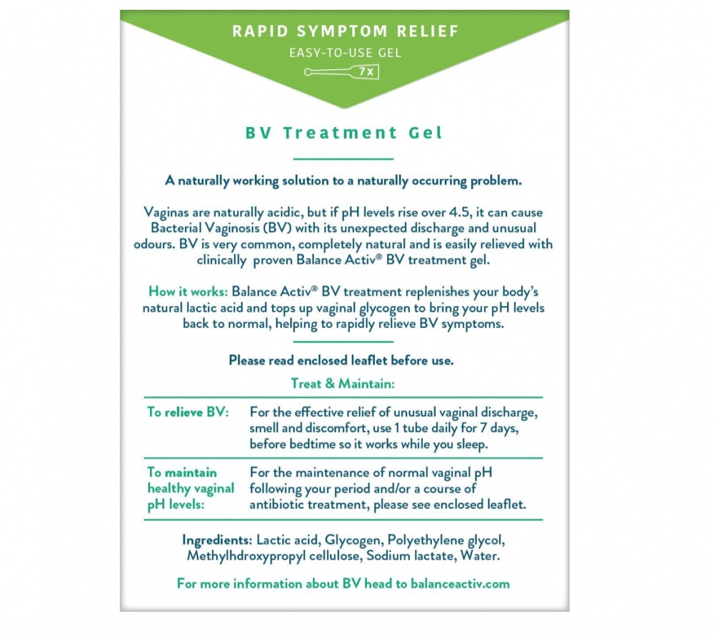 Balance Activ BV Treatment restores your body's natural balance. Seven easy-to-use gel tubes to maintain healthy vaginal pH levels. A natural solution to a naturally occurring problem. Works while you sleep.